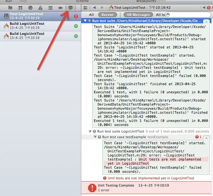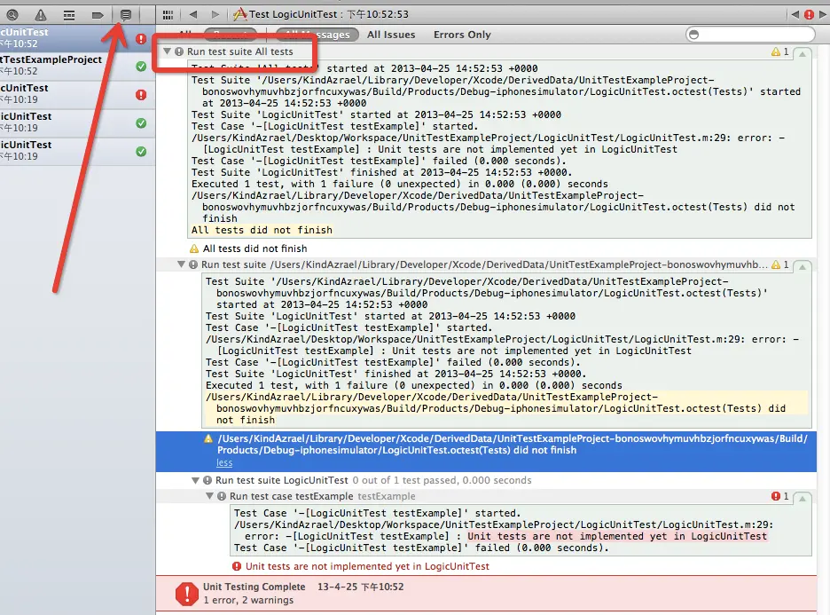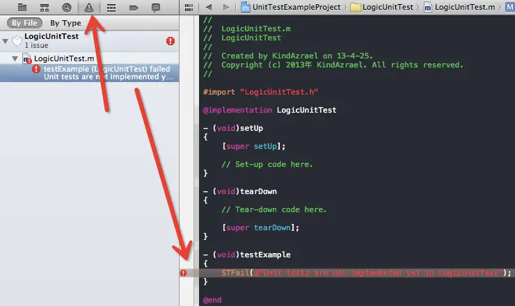 Xcode会显示Build Successed 和Test failed,选择 View -> Navigators -> Issue(或者Command + 4)会有下图中的结果