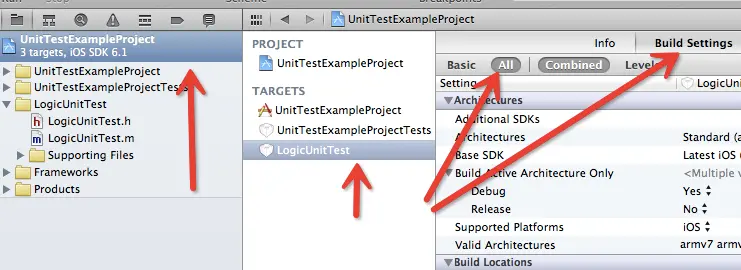 选择新建的Logic UnitTest单元测试target,并选择Build Setting栏和“All”