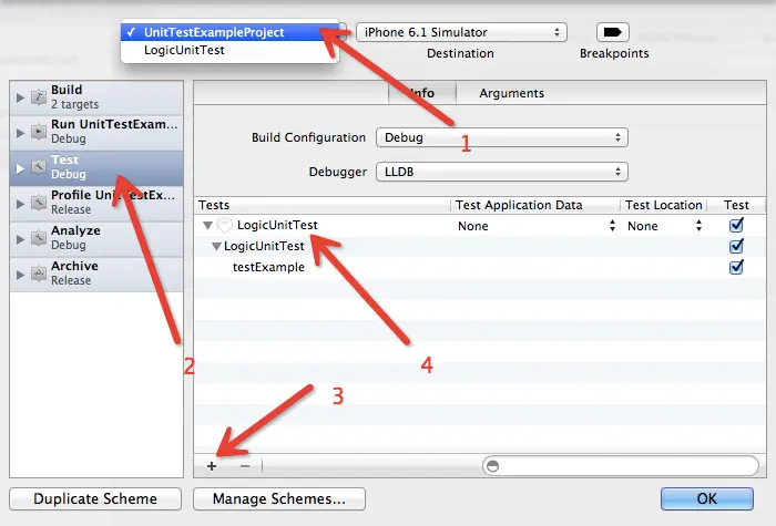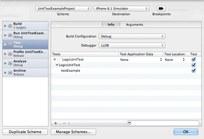 为了验证新的scheme已经加入了新建的target,对这个新添加的scheme进行编辑,你可以在选中左侧的Test后看到右边显示出新添加的LogicUnitTests Target,说明该scheme已经默认添加了新添加的Target。