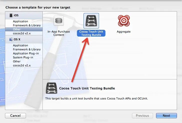 如果在新建工程的时候没有选择Include Unit Tests的话,则可以手动去添加单元测试。 下面首先介绍下向工程添加单元测试的target: 1、选则File->New->New Target,在左侧栏中选中iOS->other,右边选择Cocoa Touch Unit Tests Bundle,如图