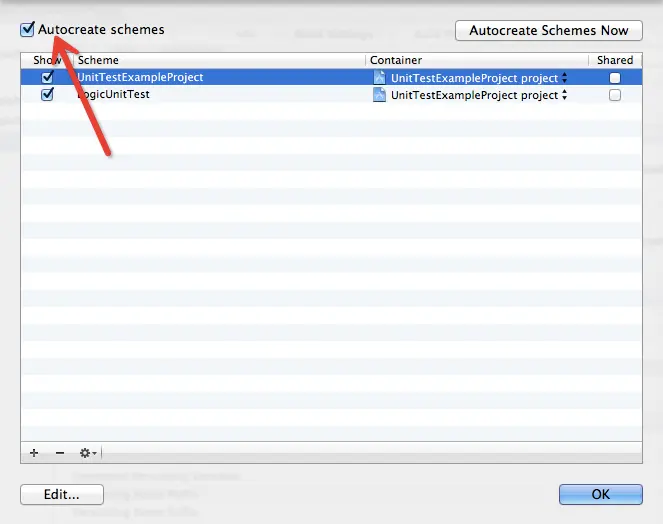 如果你不想在新建target的时候新建scheme(因为application unit tests可以在真机和模拟器上运行,并且时在程序运行时进行测试,所以完全可以和应用本身的target共用一个scheme,这样进行应用单元测试的时候就不用切换scheme。)可以选择上图的Manage Schemes,去掉Autocreate schemes,如下图: