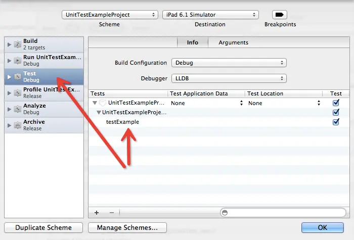 果是在新建的时候系统默认新建了scheme,则可以通过新的scheme来进行application tests,如果没有默认新建scheme,则可以编辑用来编译工程的scheme,选择左侧的Test如图: