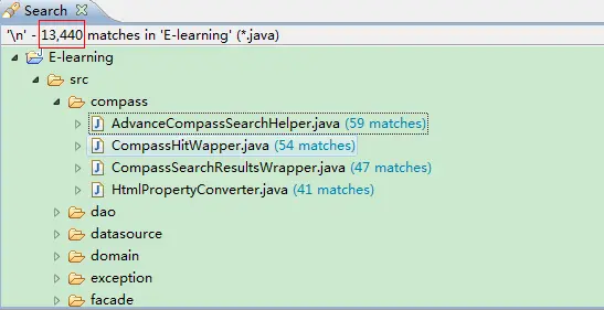公司网络又不能下载,所以想想eclipse是不是又类似功能,找了下没有,但突然一想有一个转弯方法:统计工程里面的\n个数